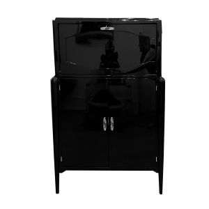 Ein Meisterwerk des Art Deco: Dieser Barschrank ist eine Hommage an den opulenten Stil der 1920er Jahre, der für seine klaren Linien, geometrischen Muster und luxuriösen Materialien bekannt ist. Der tiefschwarze Lack verleiht ihm eine zeitlose Eleganz, während die sorgfältig gestalteten Details seine kunstvolle Natur unterstreichen.
