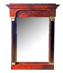 Empire Kommoden, -Spiegel und -Schränke gehören in unserem Portfolio zu den herausragenden Objekten aus der Klassik des französischen Kaiserreiches unter Napoleon I. – weswegen sie umgangssprachlich auch manchmal unter „Napoleon-Stil“ firmiert. Besonders in der Innendekoration und Möbelkunst zeigt sich das Empire mit Stilelementen der griechisch-römischen und der ägyptischen Kunst (Dekors mit mythologischen Figuren: Sphinx, Löwe, Greif) als Gegenbewegung zum Barock bzw. Rokoko. Wuchtige, flächenbetonte Formen, streng kubische Möbel und Einrichtungsgegenstände (Empire – Kommoden, -Spiegel und – Schränke) unterstreichen den repräsentativen Charakter ebenso, wie erlesene Materialien, die in kunsthandwerklicher Präzision verarbeitet werden. Geradlinige Strenge und vornehme Zurückhaltung auch bei den Empire-Spiegeln, die mit geschnitzten Verzierungen und in Sonderheit mit den erwähnten Figuren und Symbolen (Fackeln, Kränze) versehen wurden. Die „Psyche“, ein kunstvoll verzierter und schwenkbarer Standspiegel, gehört zu den besonderen Möbelstücken der Zeit.